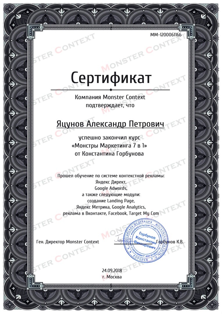 Прошел обучение по различным инструментам интернет-маркетинга у таких лидеров рынка, как: Сity Business Schooll, Genius Marketing, Convert Monster.
