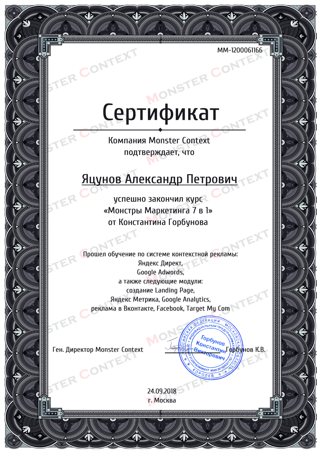 Прошел обучение по различным инструментам интернет-маркетинга у таких лидеров рынка, как: Сity Business Schooll, Genius Marketing, Convert Monster.
